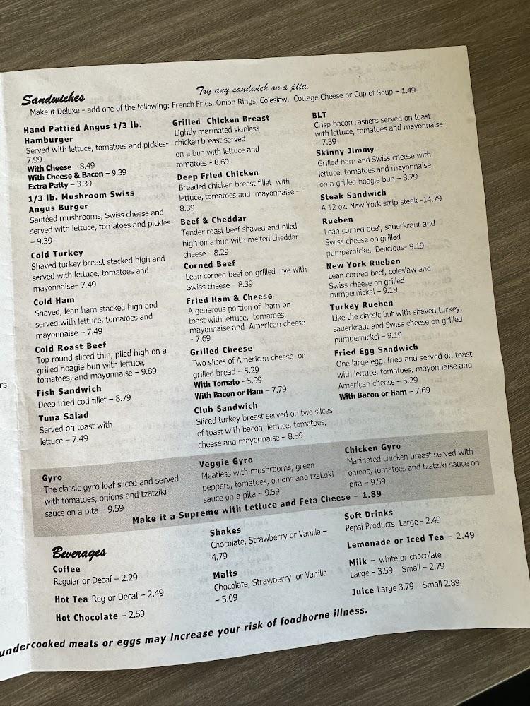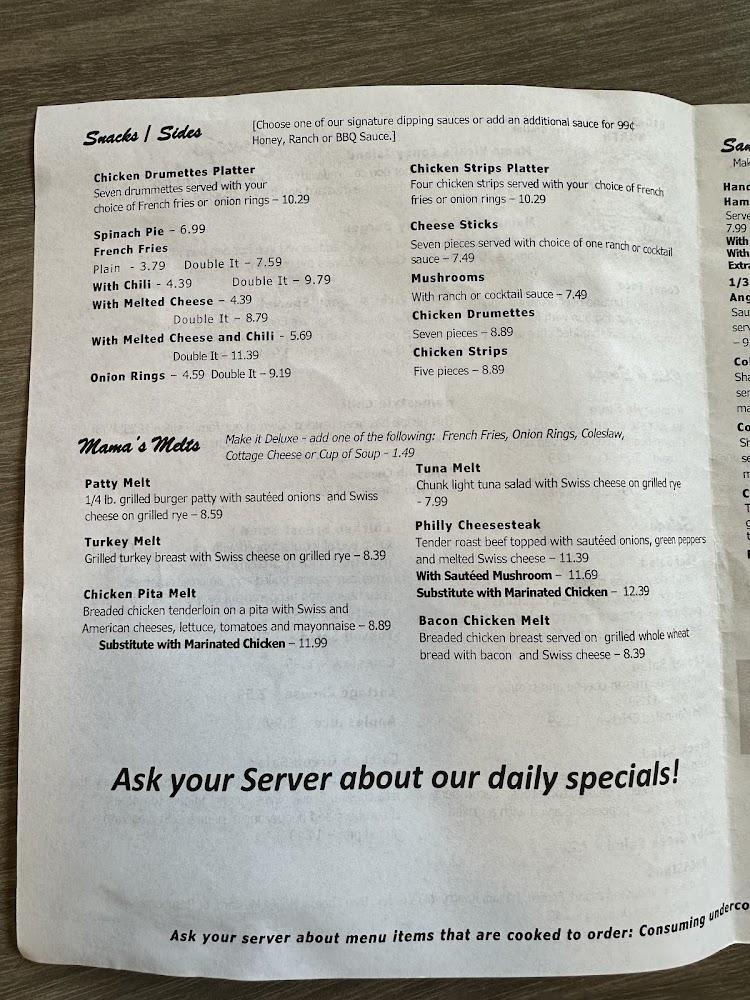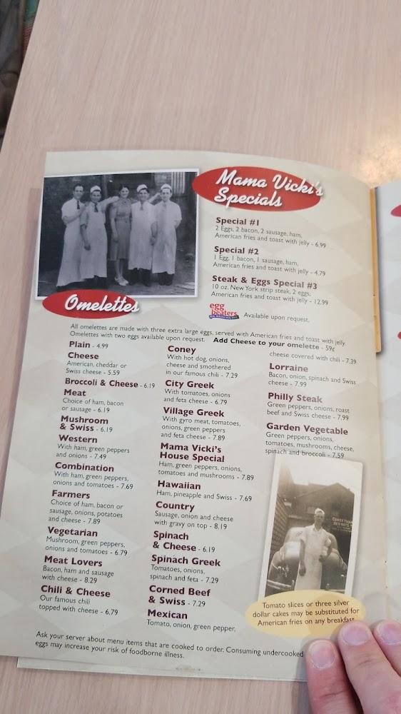 The menu at Mama Vicki's offers a variety of simple, traditional American dishes. Breakfast shines brightly, with options such as omelettes and pancakes. The lunch menu features Coney Island dogs, burgers, and salads. Popular items include chili and gyros. Prices are affordable, averaging around $7.15, making it approachable for most diners. The selection encourages sharing, with smaller portions available. Don't miss the opportunity to enjoy daily specials, adding variety to each visit.